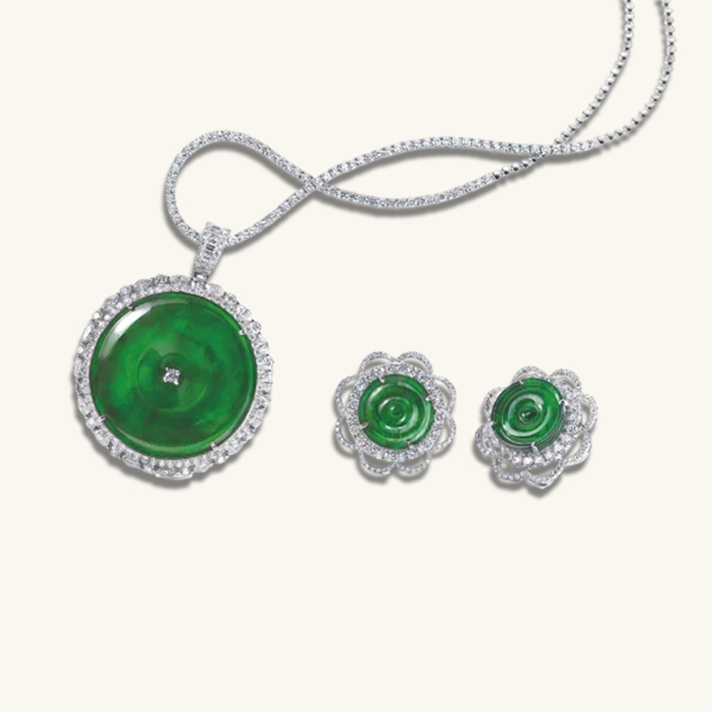 Add to cartHanging majestically from a white gold chain, a series of white – gold encased diamonds and jades leads to a glowing pear